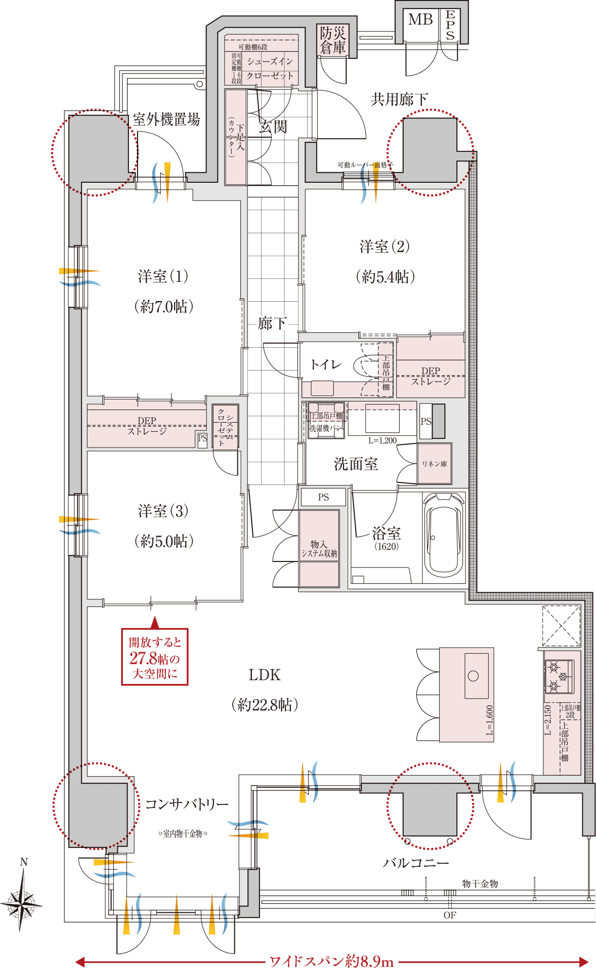 洋室(3)を開放すると約27.8帖の大空間に。