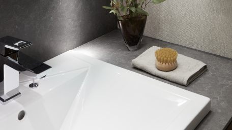 カウンターと立ち上がり部分には美しい天然水晶の質感と樹脂の強度をあわせ持つフィオレストーンを採用。
