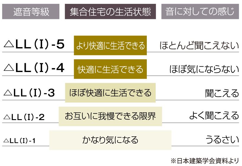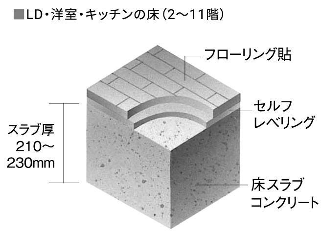 集合住宅では上下左右に住戸が隣接しているためプライバシー確保と隣戸からの音を防ぐためにも防音対策は重要です。音の伝わりを軽減するために決め手となるのはコンクリートスラブの厚さと床の仕上材です。一般的には、子供が走り回ったり飛び跳ねたりするなど重量衝撃音に対しては、コンクリートスラブが厚いほど遮音性能が向上し、スプーンなどを落とした場合などの軽量衝撃音に対してはクッション性のある仕上材を使用するほど遮音性能が向上します。