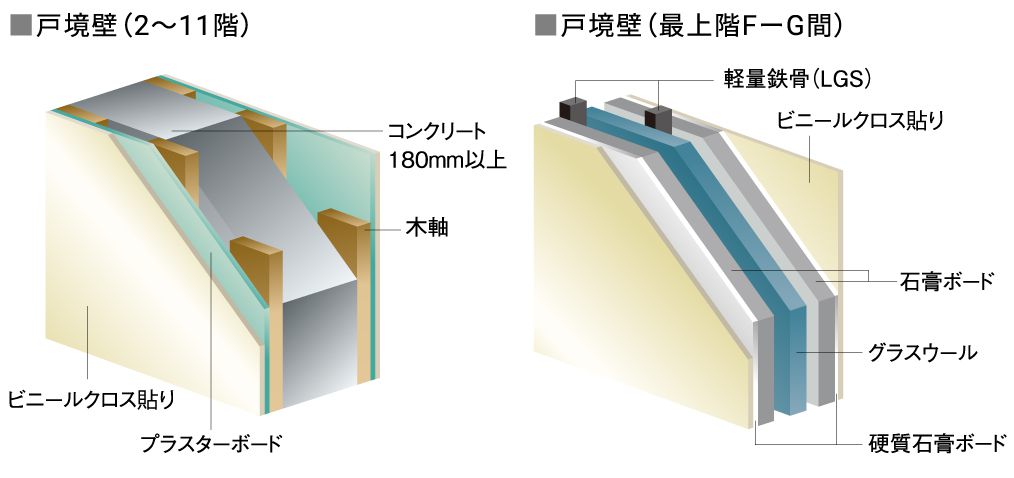 隣戸からの話し声などの生活音は一般的には空気中を伝わり戸境壁を透過して聞こえることから空気伝搬音と呼ばれています。このような音については戸境壁の躯体を厚くすることが対策として効果的です。本物件では戸境壁のコンクリートの厚さは180mm以上を確保しています。