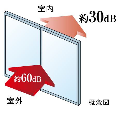 一部のサッシュには、外からの音を、約30dB低減(メーカー公表)させるといわれているT2サッシュを採用しています。