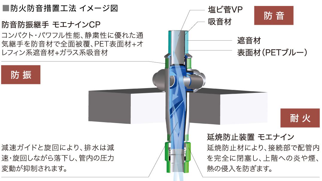 排水立て管の床貫通部分には、防音・防振・耐火部材を立て管及び通気継手と一体成型したモエナイン排水システムを採用しています。排水管には吸音材と遮音材と表面材の3層の防音措置を施し静粛性を高めています。防音材で全面被覆された防音防振継手により防音性能を高め、火災時にも延焼防止材により接続部で配管内を完全に閉塞し上階への煙や熱の侵入を防ぎます。