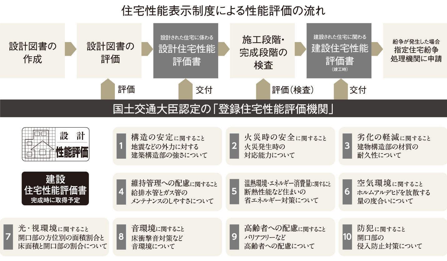 設計住宅性能評価は「日本住宅性能評価基準」に基づき示されます。この基準は、評価のための技術が確立され広く利用できること、設計段階で確認が可能であること、外見からは容易に確認しにくい点を優先することなどの趣旨に従って、右記の10分野33項目が定められており、必須評価項目として4分野10項目が対象とされています。