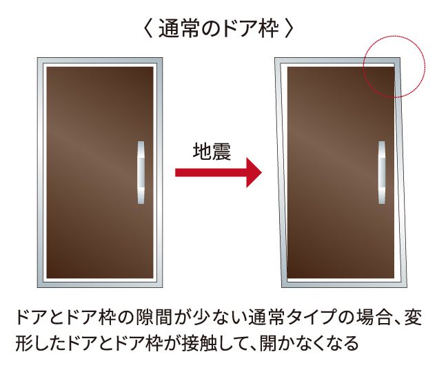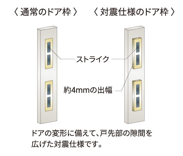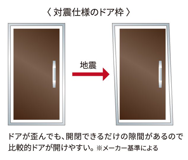 地震による圧力でドア枠が変形し玄関が開かなくなることがあります。玄関ドア枠が歪んでもドアとドア枠の間に隙間を確保し、多少変形した場合でもドアを自力で開けられ避難経路が確保できるよう配慮しています。