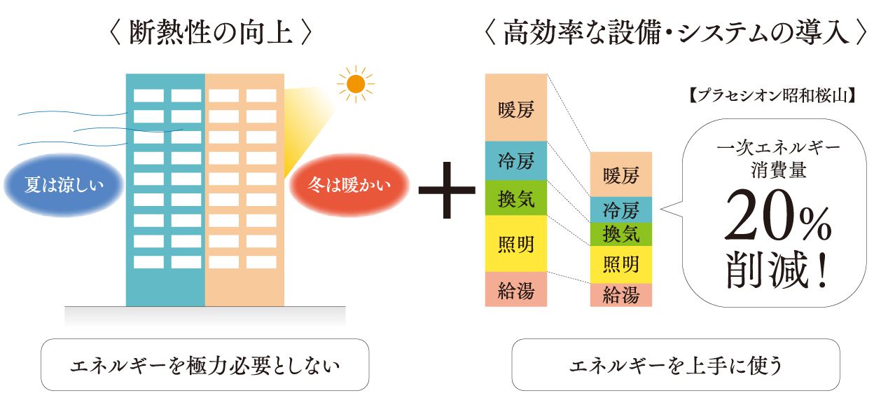 ZEH-M Oriented(ゼッチマンション オリエンテッド)とは断熱性能を向上させるとともに、効率的な設備等の導入により、快適な室内環境と大幅な省エネを両立し、年間の一次エネルギー消費量の20%以上削減を実現する住まいです。