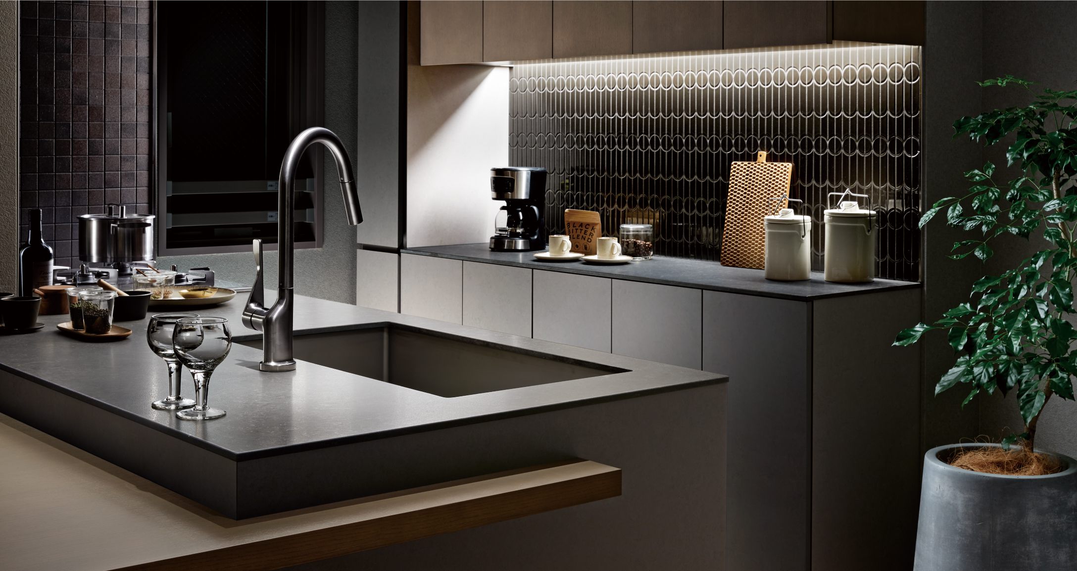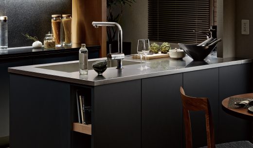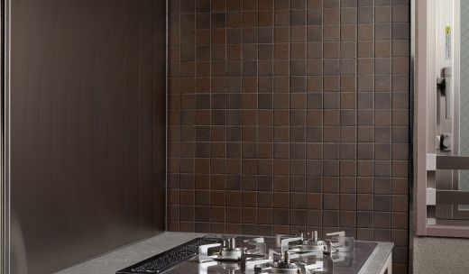 ステンレスとのコントラストが美しいデザインタイルを採用。深みのあるその表情がキッチンに深い格調をもたらします。