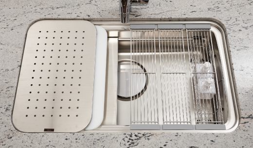 ワークトップスペース、アシストスペース、ミドルスペースの三層構造。水はね音を低減する静音仕様。(※上記写真にはオプションを含んでいます。)(※F・Gタイプを除く)