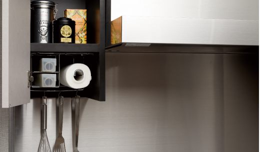 キッチンペーパーホルダー付の吊戸棚。フックやラップ収納スペースを設け調理器具の取り出し易いのも魅力です。(※Bタイプを除く)