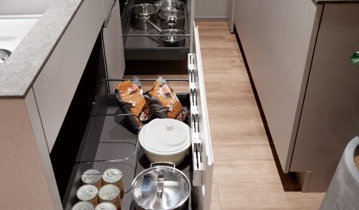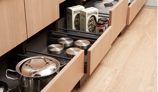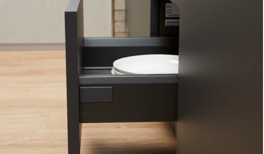 スライドキャビネットは、スムーズな引き心地を実感でき、強く閉めても直前で速度を調節し静かに閉まります。