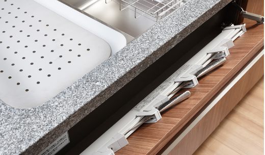 サッと開いて出し入れしやすいシンクの幕板部分を有効活用した包丁ポケット。安全性に配慮したチャイルドロック機能を搭載しています。