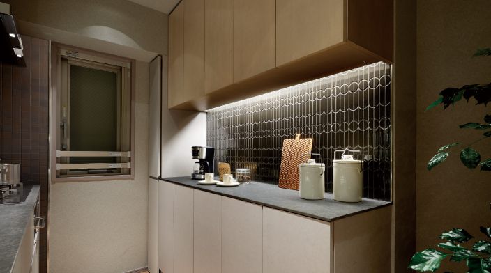 インテリア性の高いマットな質感が美しいメラミン化粧板を採用。人造大理石、ステンレス、タイルとの美しいハーモニーを奏でます。