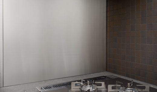 キッチンに高いインテリア性と高級感を演出するステンレス製パネル。美しさに加え、耐久性や清掃性にも優れています。