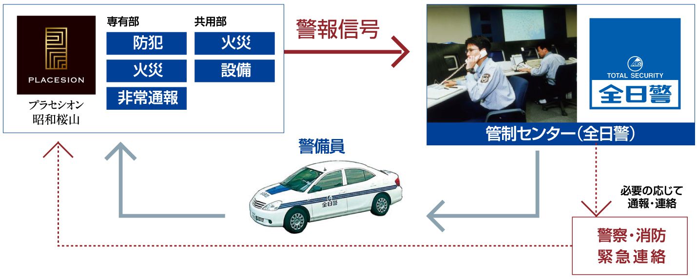 防犯や火災など24時間体制で集中監視。異常をキャッチすると「全日警」へ自動通報します。株式会社全日警ではその情報をもとに適切かつ迅速に対応しプロが駆けつけます。