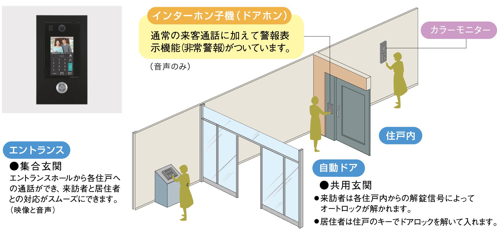 来訪者を確認し、住まわれる方の安全とプライバシーを守るためエントランスにはカラーモニター付オートロックシステムが採用されています。ドアの開錠は鍵を持っている居住者及びインターホンで入館を許可された来訪者だけを通過させます。エントランスと玄関前の2箇所で来訪者を確認できる防犯システムです。(※イラストはイメージです)