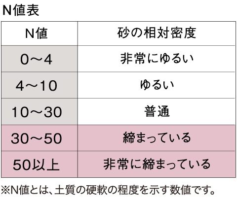 それぞれの地点や深さにおける地盤の硬さや土質、地下水位の深さがわかり、建物本体を支えるための支持地盤決定や、基礎工法選定のための重要な情報となります。
