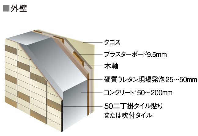 外壁には約150mm~200mmのコンクリートを採用しています。地震に強い強度と風雨による劣化を軽減する耐久性に優れた構造を実現します。